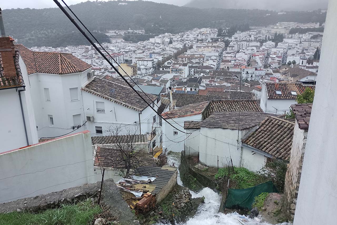 Más de 500 litros de lluvia por metro cuadrado hasta las 19:10 horas en Grazalema, una persona herida tras derrumbarse una vivienda en Ubrique, más de 25 carreteras cortadas en la red diaria provincia, cientos de personas desalojadas de sus viviendas en diversas localidades como Villamartín, Puerto Serrano, Jerez o Torre Alháquime entre otras, trenes suspendidos, comunicaciones imposibles en diversos puntos, derrumbes, ríos desbordados o a punto de desbordarse, casas donde el agua salía hasta por los enchufes… es el primer balance del paso de la borrasca Leonardo por la Sierra de Cádiz.
