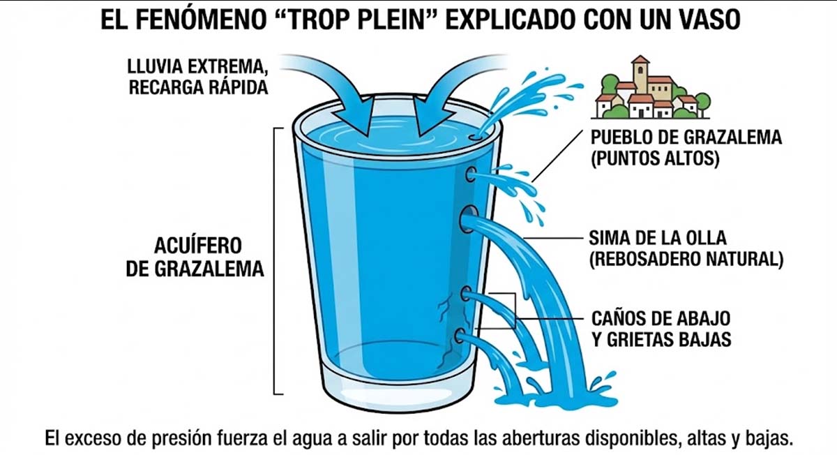 La primera explicación que aporta es que después de que se hayan superado con creces los 2.000 litros por metro cuadrado en lo que llevamos de año ha provocado que los acuíferos estén a rebosar. Es decir, la montaña está llena de agua y esto está produciendo el fenómeno ‘Trop plein’ o rebosamiento.